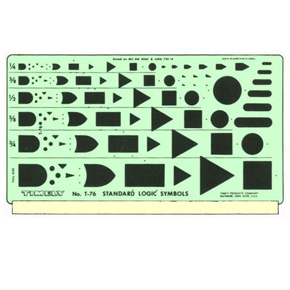 Six sizes of logic symbols from 1/4 size to full size. Symbols are based on Mil. Std. 806C and ANSI Y32.14. Has a slide-easy lower edge strip.