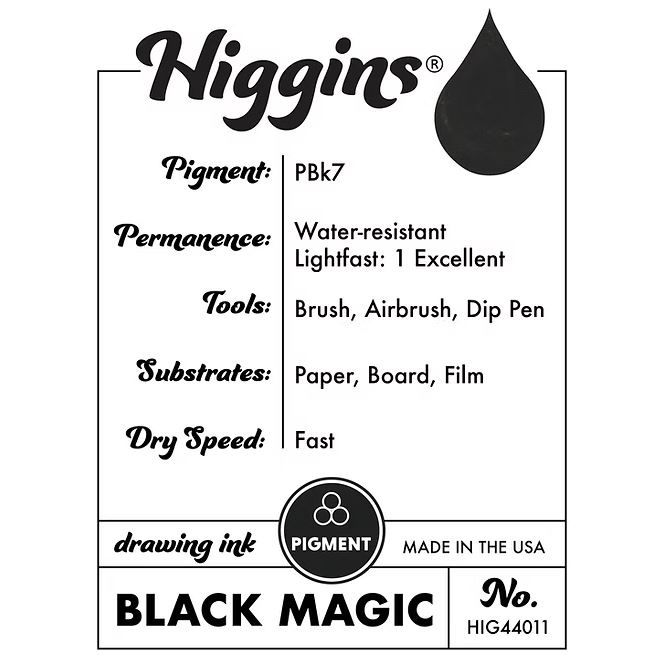 Usage: May be diluted with distilled water. Close cap tightly after use. Do not mix with acids, or use as tattoo ink. For use with dip pens, brushes, and airbrush. Not launder-proof. Clean tools with water immediately after use or with Higgins Pen Cleaner for dried ink. Shake well before use as the black pigment may settle over time. AP, Non-toxic, Conforms to ASTM D-4236