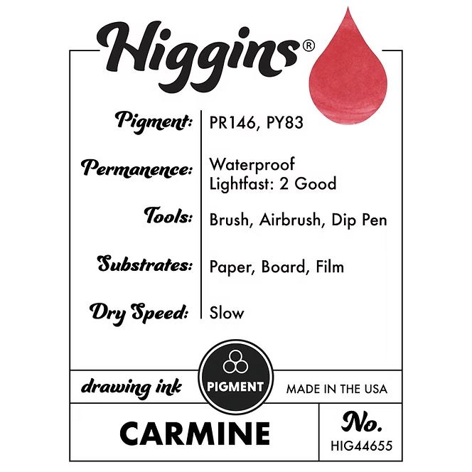 Micro-pulverized pigments are suspended in a professional quality shellac solution. Colors are brilliant and inter-mixable with other Higgins Inks to create custom colors. Can be diluted with distilled water. Compatible with dip pens, brushes, and airbrushes, with good adhesion to most surfaces. Close cap tightly after use. Do not mix with acids, or use as tattoo ink. Not launderproof. Clean tools with tap water immediately after use or use Higgins Pen Cleaner for dried ink. Shake well before use. Made in the USA
