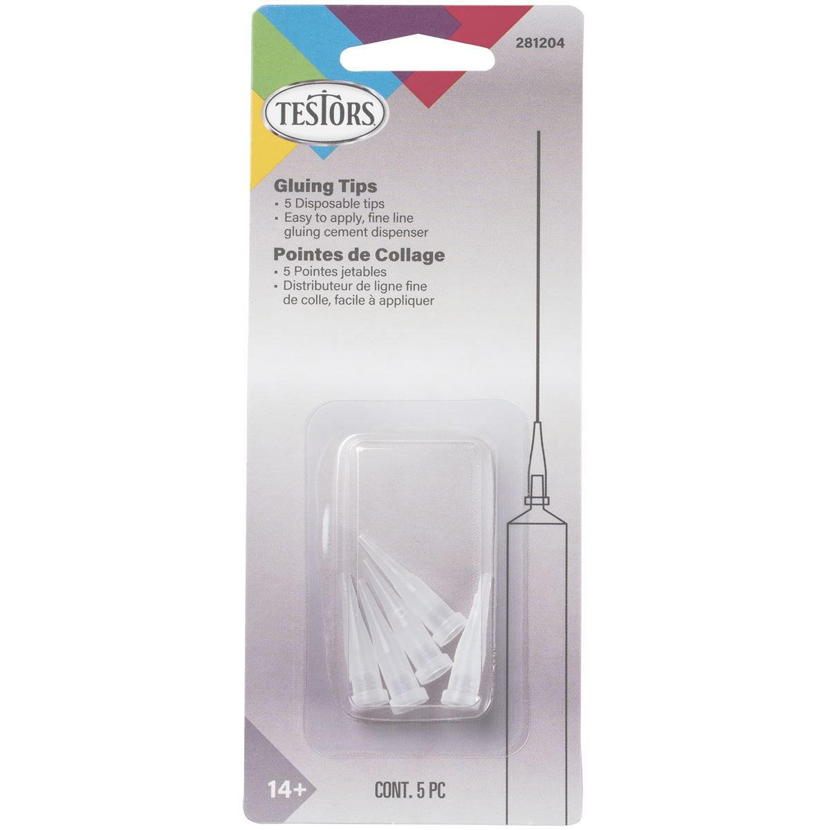TESTORS-Precision Gluing Tips. These disposable tips are designed for use with Testors Cement tubes (sold separately). Simply twist onto the end of the tube to turn it into an easy-to-apply fine-line applicator. Each tip is made of plastic and can be snipped to create larger holes if needed. This package contains five disposable tips. Made in USA.
