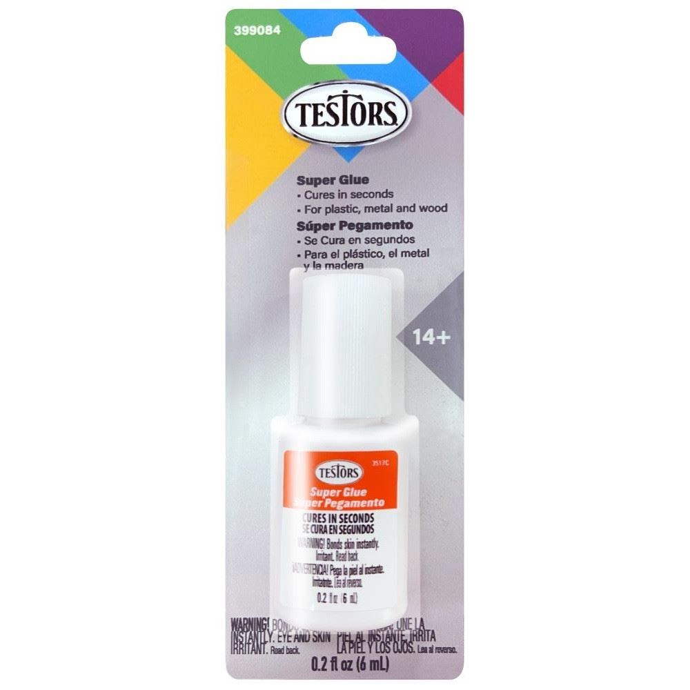 TESTORS-Super Glue. This package contains one 0.2 fl.oz. bottle of Super Glue. It cures in seconds and is ideal for plastic, metal, and wood items. WARNING-Eye and skin irritant, bonds skin instantly. Keep out of reach of children. Conforms to ASTM D4236. Made in USA.